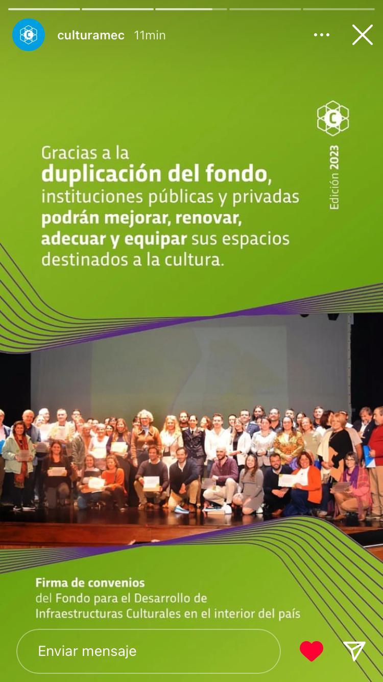 El pasado 30 de abril de 2024, en la ciudad de Durazno, participamos en el evento organizado por la Dirección Nacional de Cultura para la firma de convenios de los proyectos seleccionados para recibir fondos del Ministerio de Educación y Cultura.