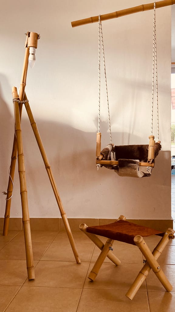 Después de almorzar llegamos al tercer y último bloque donde nos dividimos en 3 estaciones de creación de 3 objetos: una hamaca, una banqueta y una lámpara. Pusimos en práctica lo aprendido creando con bambú y otros materiales que el colectivo ya conoce como el trabajo con cuero y lana (fieltro)